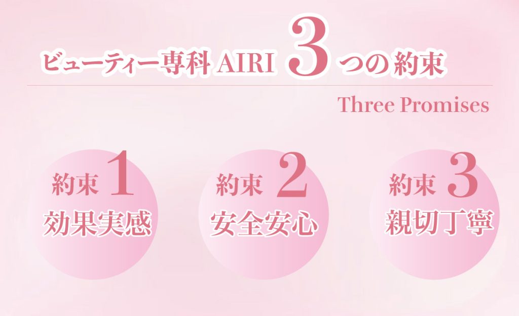 AIRIビューティー専科では、地域の皆様にお選びいただくために下記3つのお約束のもと、サービスを提供しています。